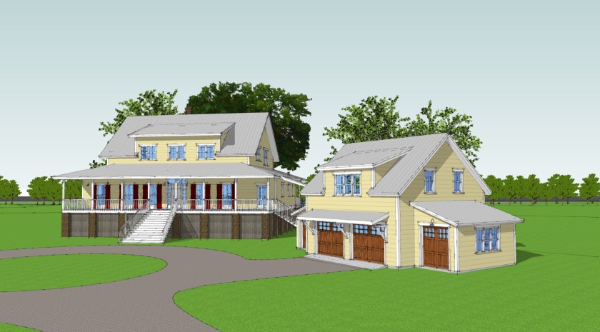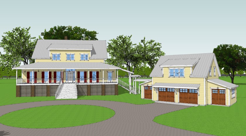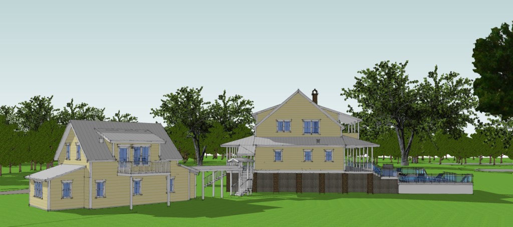 The result is a traditional-looking home with deep porches that is built up on piers to elevate it above potential floodwaters. Constructed of SIPs, it is engineered to weather storms that seasonally batter the region. The rear of the house faces the river and opens onto a porch which transitions a few steps down to a large pool and pool deck, offering plenty of outdoor living space. The first floor has generous open spaces for cooking and entertaining, as well as a guest suite that could one day become a master suite. A bathroom is directly accessible from the porch for use when coming in from the pool, and there is a “fish room” housing tanks and equipment for tropical fish! The fish tanks are visible from the living area, where they flank the fireplace. On the second floor there are two bedrooms (master and child’s) each with ensuite bath, as well as a craft room. Both bedrooms open onto a second-floor porch with magnificent views to the river. The planned garage will have a small apartment above which will serve as an in-law suite, complete with its own second-floor deck.
