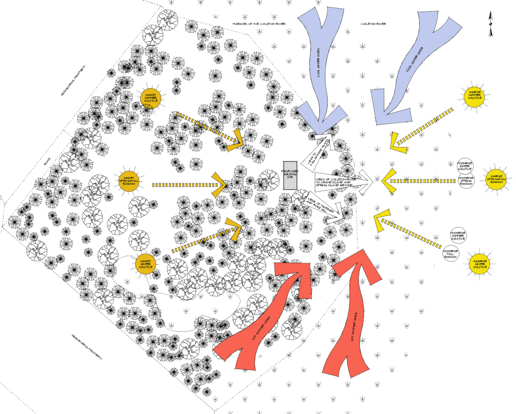 Considering the specific site is especially useful in green home design. Sun angles, wind direction, topography, temperature variation (both diurnal and seasonal), and vegetation – especially mature trees – are all factors that can have an enormous impact on the energy efficiency of a home. Properly considered, a custom home design can make the most of these elements while minimizing their disadvantages.